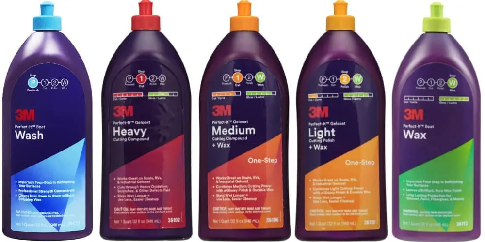 Sistema de acabado avanzado para Gelcoat de 3M. Limpiar, cortar, pulir y encerar para un acabado brillante.