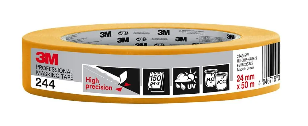 Scotch® 244 Professional Masking Tape for use with both water based and solvent based paints. Resistant to temperatures up to 100°C and excellent resitance to UV making it ideal for prolonged exterior use in damp conditions. Very good holding power and precise edge tear for professional results with no paint bleed through. Can be removed in dry conditions for up to 150 days or in damp conditions for up to 30 days when used inside or up to 21 days when used outside. The extremely thin backing (0.085 mm) achieves sharp and ultra thin paint edges.