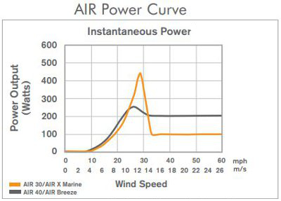 The software of the New Air Breeze has been optimized for a more consistent energy output throughout the wind range but particularly for lower wind speeds and the start up speed has been reduced. In many areas, wind speed varies throughout the day and drops at night reducing the average daily or monthly wind considerably. High wind speeds are rare and short-lived and when anchored we try our best to find a sheltered spot. The New Air Breeze has been optimized for a lower start up speed and higher performance at lower wind speeds and can outperform even 400w units. For areas with lower wind speeds we recommend the Air Breeze as a cost effective, lightweight unit with simple installation.