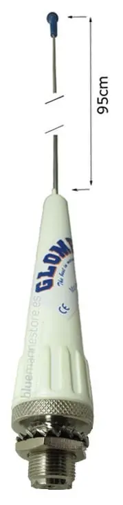 La antena Glomex RA109SLS es de acero inoxidable muy ligero 3db 900 mm (35'') tipo látigo que puede absorber fuerzas extremas. Muy fiable, resistente, duradera con muy poca resistencia aerodinámica, está diseñada para ser instalada en embarcaciones de vela en el tope de mástil pero también es adecuada para embarcaciones de motor y auxiliares. Conector estandar macho SO 239 en la base de la antena para conectar el enchufe PL259.