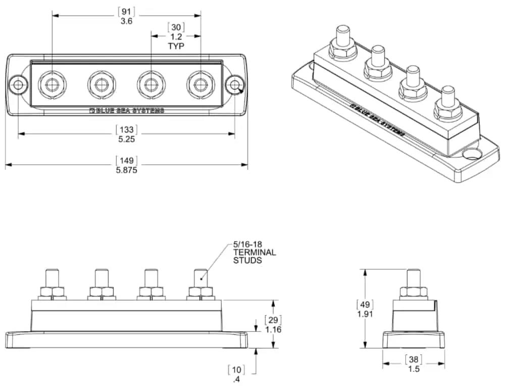 - Los pernos de acero inoxidable moldeados por inserción eliminan la necesidad de asegurar la tuerca y permiten un alto par para un excelente contacto eléctrico