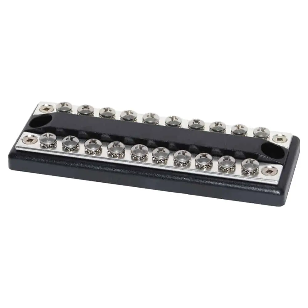 Tin Plated 100 A dual copper busbar, used to consolidate multiple wires or feed multiple circuits. Combine both positive and negative circuits in the same bus bar.