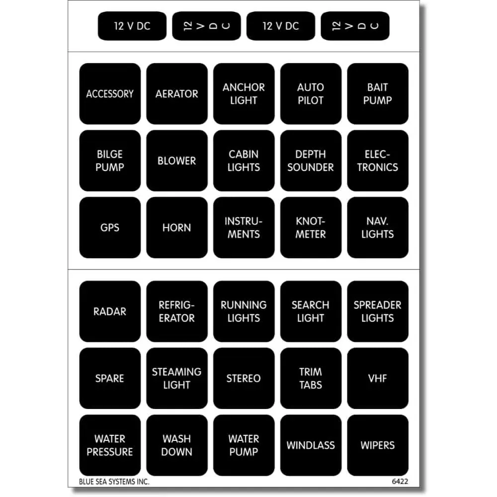 6520-0003 Blank 6520-0005 12 Volt DC 6520-0004 12V DC Outlets 6520-0038 Anchor Wash Down 6520-0045 Bait Well 6520-0049 Battery 6520-0053 Battery Parallel 6520-0055 Bilge 6520-0062 Bilge Pump 2 6520-0453 Bilge Pump On-Off-Auto 6520-0068 Bow Light 6520-0074 Cabin 6520-0090 CB Radio 6520-0093 Cellular Phone 6520-0095 Chart Light 6520-0096 Chart Plotter 6520-0100 Cockpit Lights 6520-0106 Compass Light 6520-0114 Courtesy Lights 6520-0117 Davit 6520-0120 DC Outlets 6520-0122 DC Sub Panel 6520-0124 Deck Lights 6520-0143 Docking Lights 6520-0144 Down Rigger 6520-0147 Electric Hatch 6520-0153 Engine Room Blower 6520-0155 Engine Room Lights 6520-0179 Fan 6520-0459 Fish Finder 6520-0189 Fishing Light 6520-0487 Fishwell Pump 6520-0190 Flood Lights 6520-0200 Fresh Water Pump 6520-0206 Fuel Pump 6520-0224 Galley Outlets 6520-0226 Gas Alarm 6520-0234 GPS / Plotter 6520-0240 Head 6520-0276 Ignition 6520-0279 Instrument Lights 6520-0292 Lights 6520-0300 Livewell 6520-0308 Macerator Pump 6520-0456 Navigation Light Anchor-Off-Nav 6520-0333 Outlets 6520-0554 Pump Out 6520-0351 Radio 6520-0378 Seawater Wash Down 6520-0385 Shower Sump Pump 6520-0393 SSB 6520-0404 Stern Light 6520-0408 Strobe Light 6520-0421 Tricolour Light 8520-0527 Trolling Motor 6520-0513 Wash Down Pump 6520-0440 Water Maker 6520-0445 Winches 6520-0450 Wiper Port 6520-0451 Wiper Starboard |