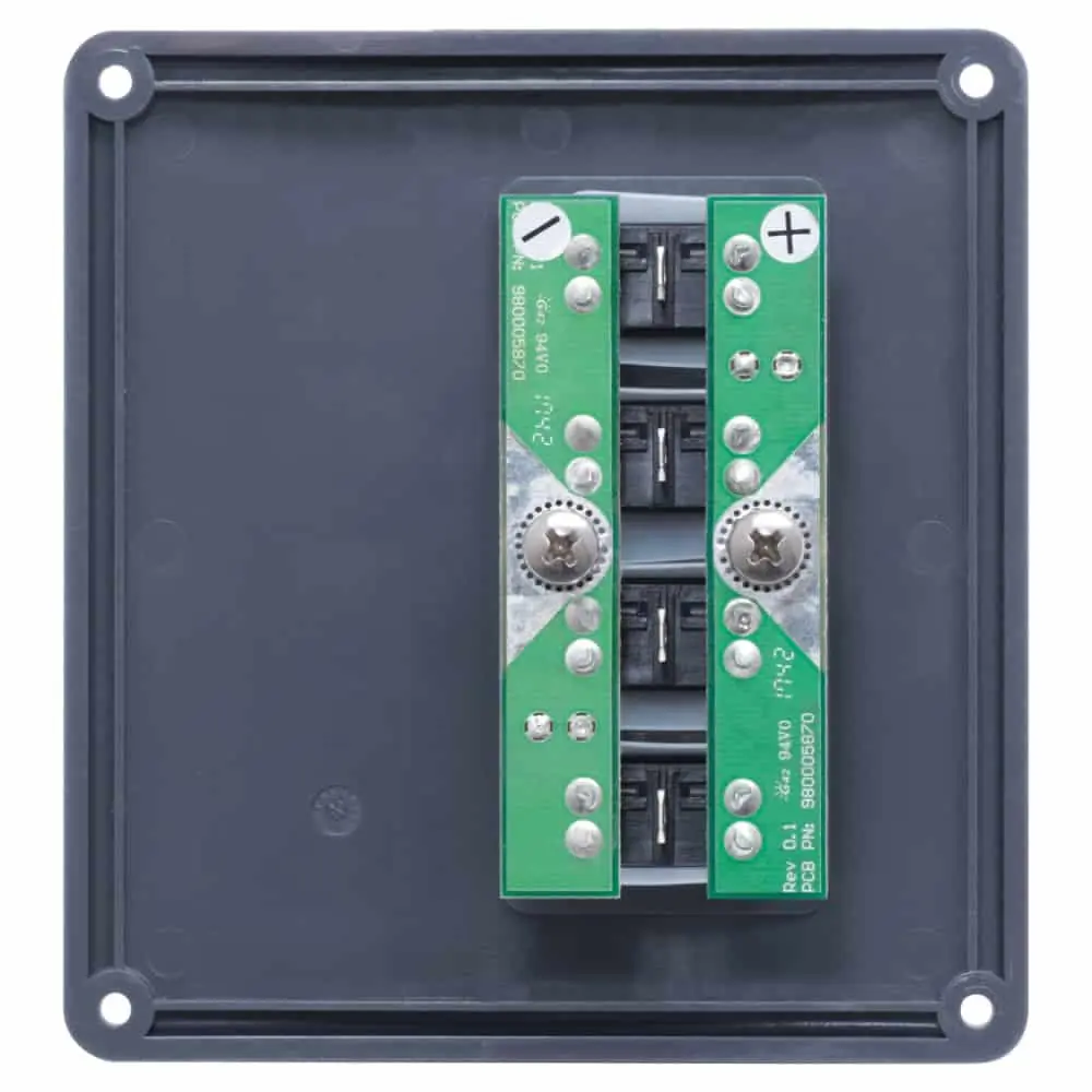 Blue Sea Systems Water-Resistant switch panels include Carling Technologies™ 15A circuit breakers with illuminated ON indication. The circuit breaker switches feature silicon boots and gaskets to protect against water ingress and are rated to IP66. The low-profile grey polycarbonate/ABS panel is UV-stabilized and flame retardant. The panel features a common BUS as well as standard push on 1/4″ Male quick connect terminals for all circuits making installation quick and simple with minimum wiring behind the panel.