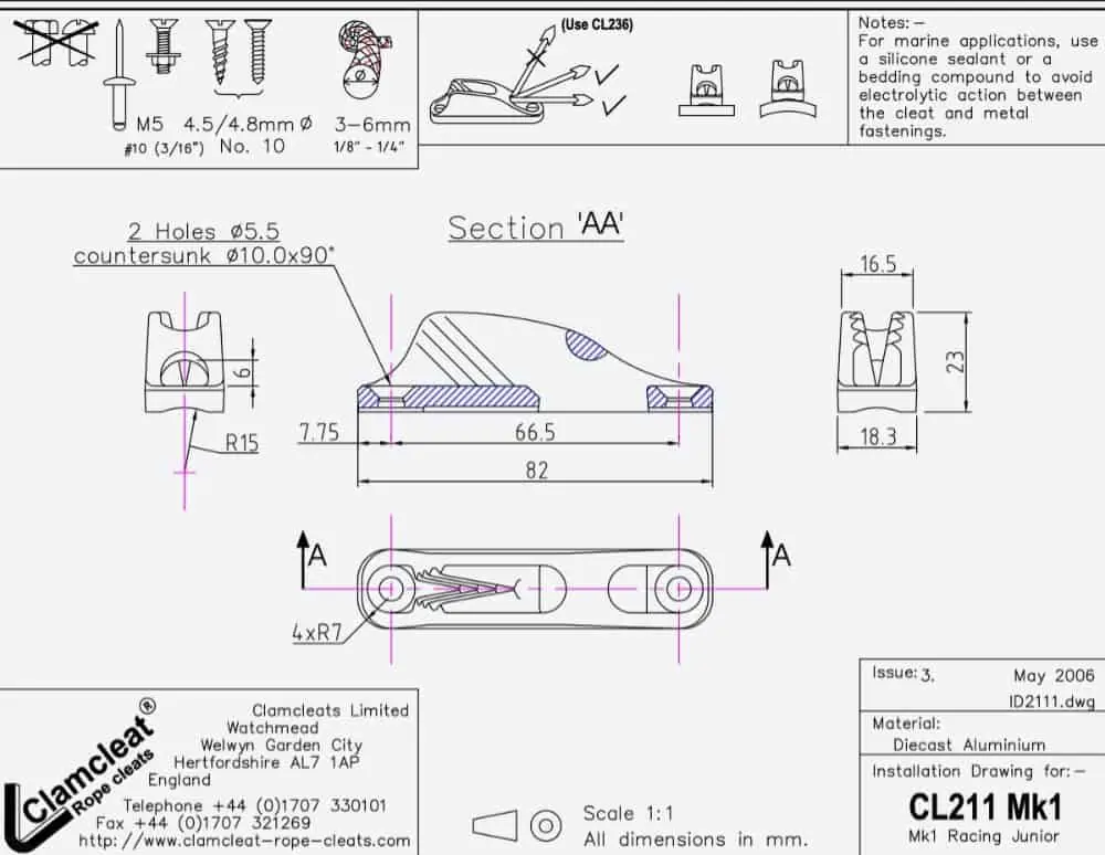 The Clamcleat® CL211 Mk1 Racing Junior is a very strong alloy cleat. The fairlead guides the rope into the teeth. The concave shaped base allows the CL211 Mk1 to be installed on both flat and curved surfaces ideal for use either on deck or for use on spars and masts.