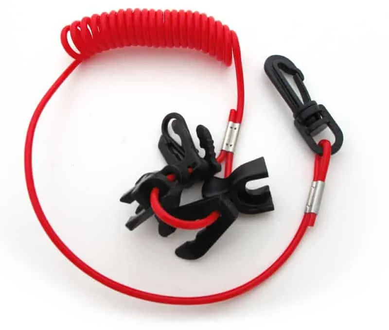 Cordón cortacircuitos, hombre al agua, para fuerabordas. Recambio esencial para motores fueraborda. El cordón espiral en plástico, tiene un clip en un extremo y siete diferentes adaptadores para la mayoria de marcas de motores fueraborda en el otro extremo.