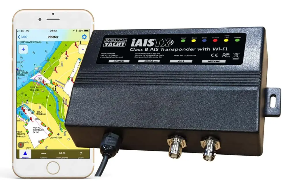 The Digital Yacht iiAISTX creates a secure, password protected, local Wi-Fi network which allows AIS and GPS data to be sent to both iOS and Android apps wirelessly. Depending upon the app/software features, you can click on a target to see target details as well as collision avoidance data such as CPA (closest point of approach) and TCPA (time to closest point of approach). Compatible with many apps: