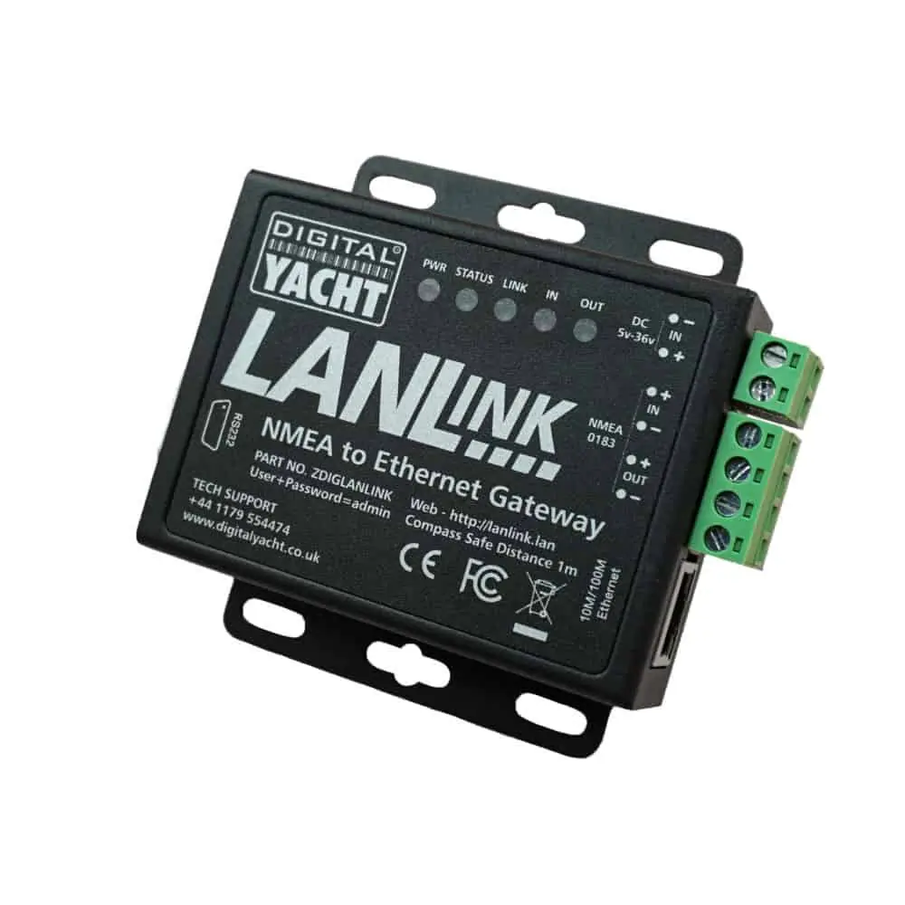 La pasarela Digital Yacht Lanlink está disponible en dos versiones, NMEA 0183 o NMEA 2000 e integra datos NMEA con el router existente del barco. Lanlink se conecta al router con un cable de conexión CAT 5/6 estándar y la interfaz web fácil de usar permite que cualquier dispositivo con un navegador configure la velocidad de transmisión NMEA y la información de IP/puerto.. Admite múltiples conexiones TCP / IP y es bidireccional. La configuración es fácil a través de muchas aplicaciones como TZ iBoat, iNavX, Navionics, NavLink, iSailor, Imray, Weather4D, SailGrib, simplemente ingrese la dirección IP y el puerto para recibir datos NMEA.
