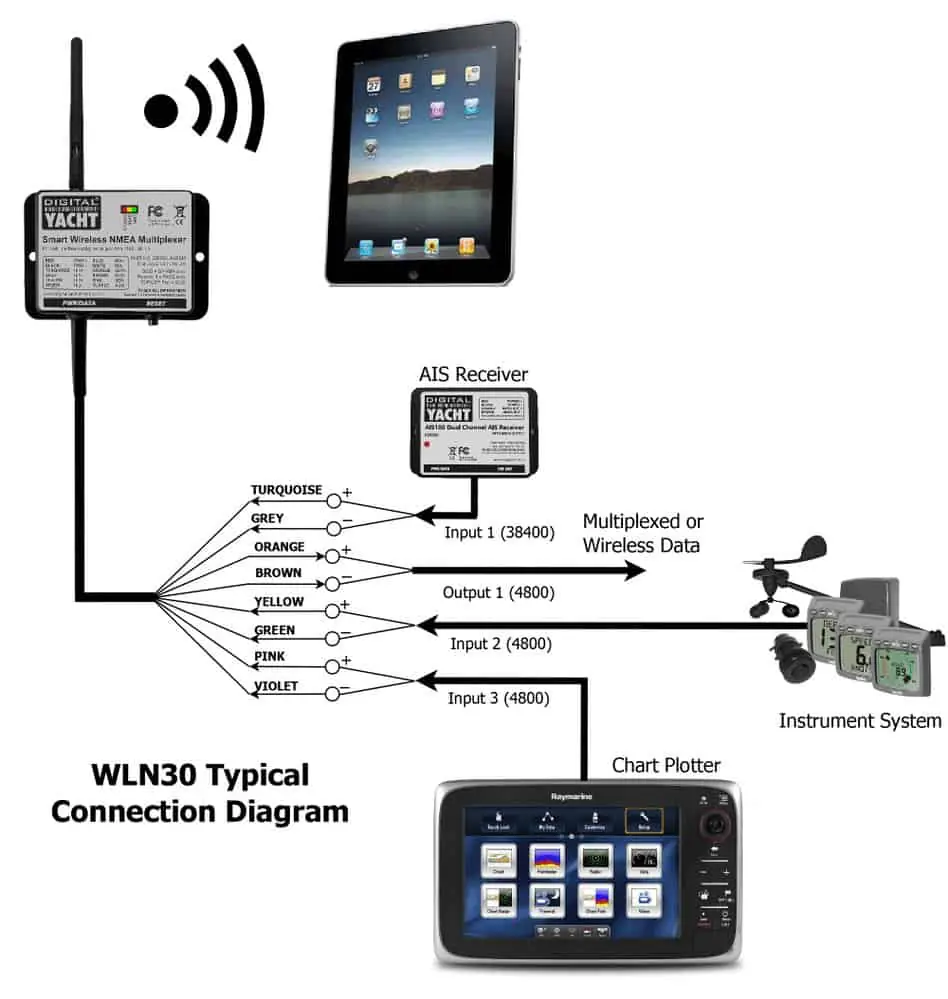 The new WLN30 has three NMEA 0183 Inputs and one NMEA 0183 output, which can be programmed through its simple browser interface to operate at 4800 or 38400 baud rates. Data received on the three inputs is multiplexed together and transmitted to any wireless devices connected to the WLN30’s wireless network.