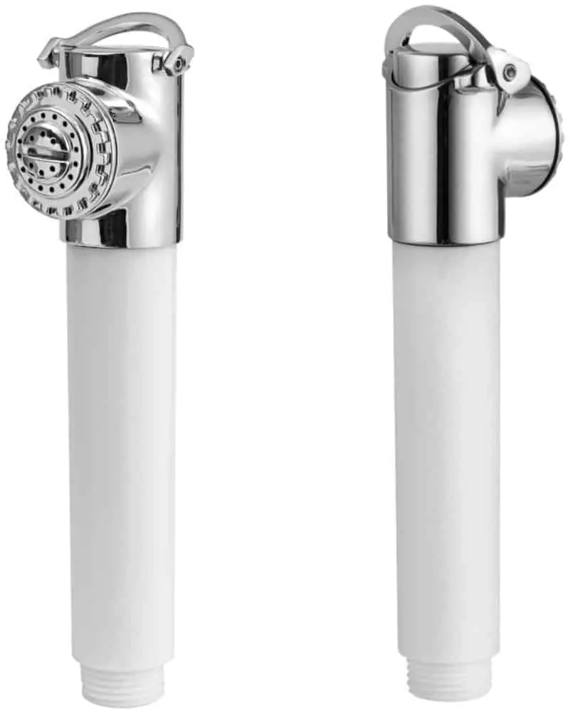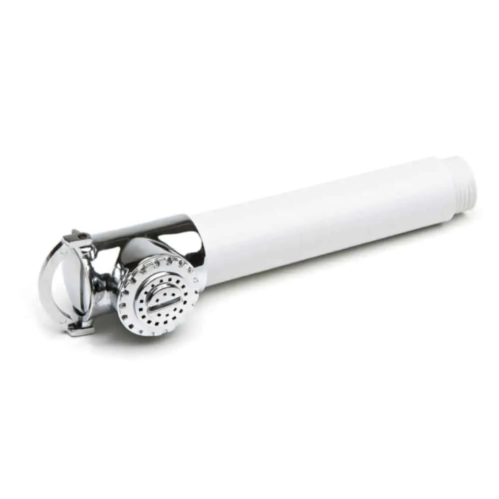 Elegant white ABS plastic and chrome shower head with push button operation and 1/2" BSP male thread.