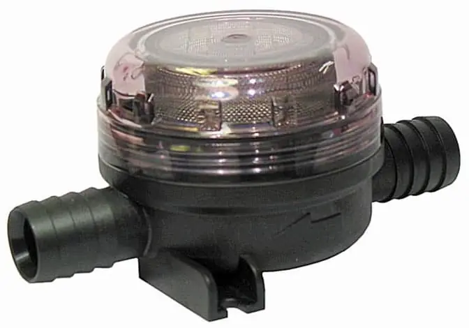 Spin on clear plastic inlet strainer recommended for all pumps onboard. Simple to install and inspect and requires no tools for maintenace and cleaning. Features screw holes for mounting onto a bulkhead.