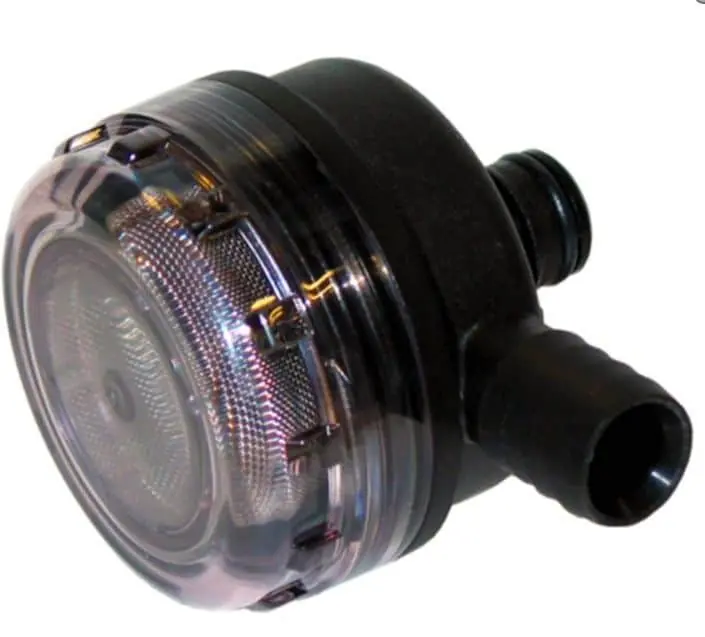 Spin on clear plastic inlet strainer recommended for all pumps onboard. Simple to install and inspect and requires no tools for maintenance and cleaning. Features a barbed connector on the inlet side for 3/8" (10.5mm), 1/2" (13mm) or 3/4"(19mm) hose and a Quad Port (clip-in) connector on the base.