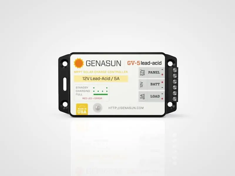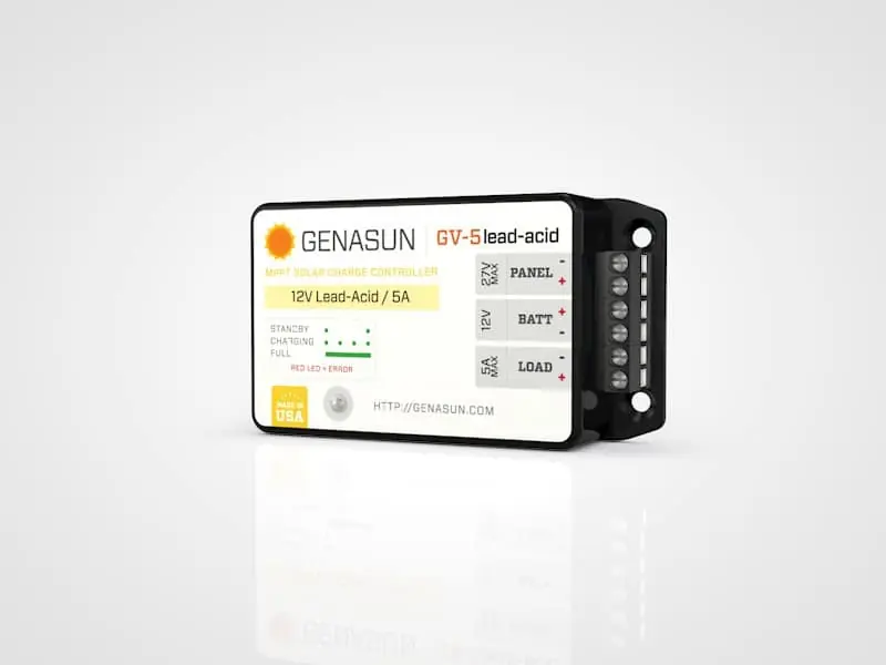 The Genasun GV-5-Pb is suitable for solar panels up to 75W (maximum voltage VOC 27V) with up to 5 amp controller output. Suitable for 12v systems with Lead-Acid, AGM, Gel, sealed and flooded batteries. An ideal controller for the smaller systems and also the 1 panel - I controller concept for maximum efficiency on larger systems with multiple panels. The Genasun GV-5 features a multi-stage charge profile with built in temperature compensation and an 5A voltage sensitive load power outlet with low voltage protection.