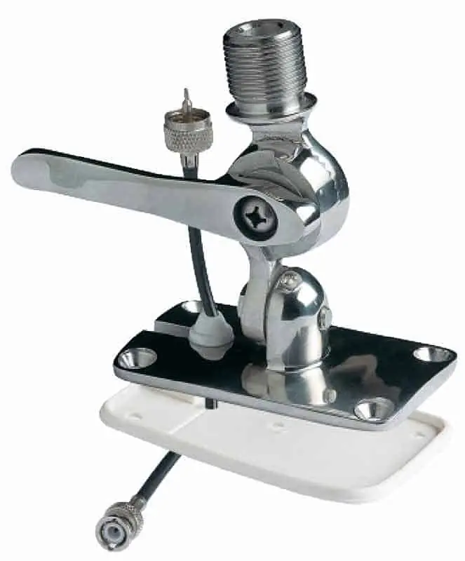 Very high quality electro polished antenna/GPS 4 way ratchet mount with standard 1" x 14 male thread. Suitable for deck or bulkhead mounting either horizontal or vertical. Features a hole and slot for passing though a GPS or coaxial connector without removal of the fitting, a locking handle and plastic gasket. Suitable for use with antennas up to 2.7 metres without additional support.