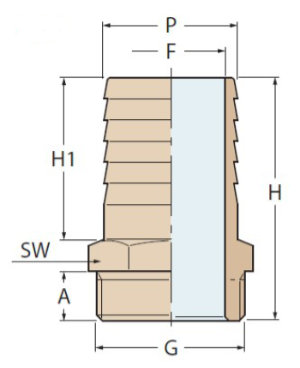 Ref G (BSP) P mm F mm A mm H1 mm H mm SW mm
