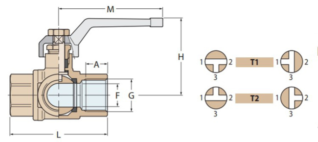 Nickel plated brass full flow 3 way diverter valve "T" flow with 3 x female BSP thread.