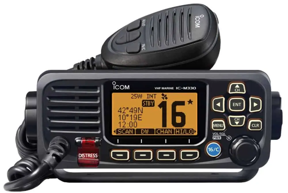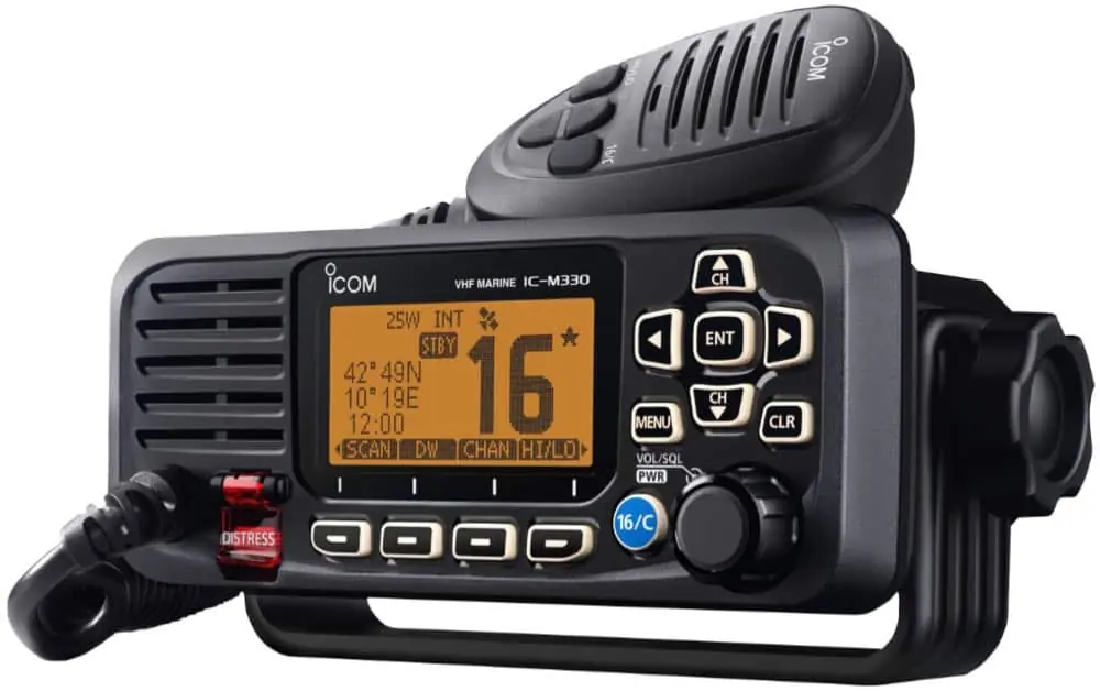 The Icom IC-M330GE measures only 156.5mm by 66.5mm with a installation depth of 110.1mm, extremely compact for a top performance marine VHF. The reduced size makes installation possible in almost any cockpit or nav station.