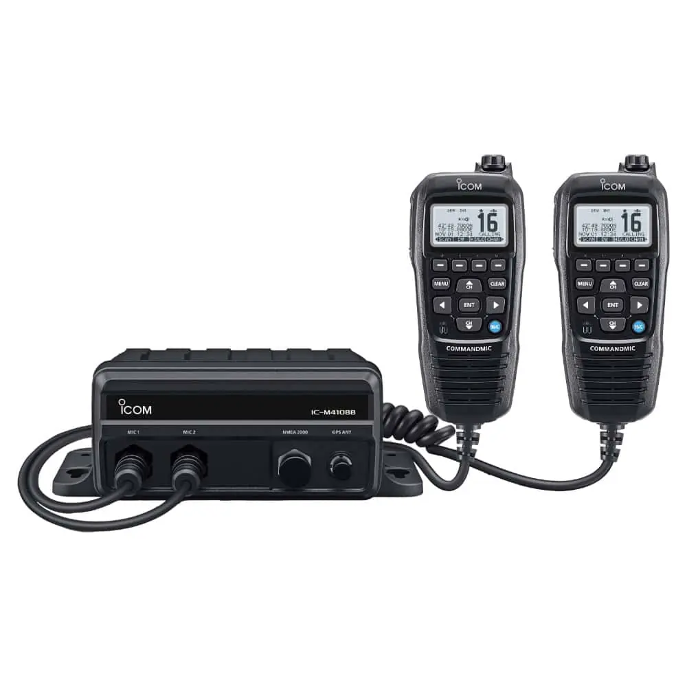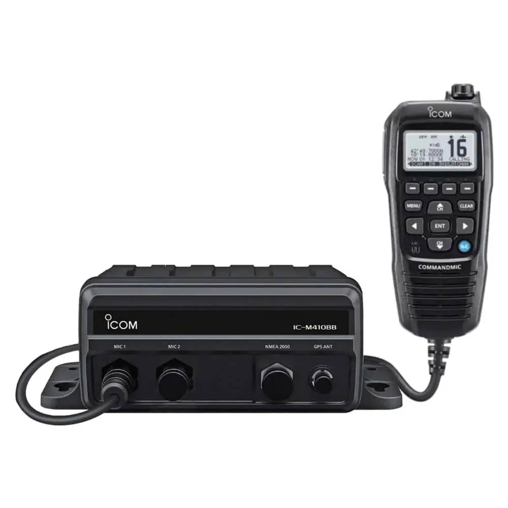 La emisora marina Icom IC-M410BB Black Box (caja negra) permite la instalación de una VHF multi-estación con todas las prestaciones en zonas donde el espacio es limitado o donde una VHF tradicional de montaje fijo no es adecuada, como en los puestos de timón dobles de los veleros modernos. La IC-M410BB permite hasta dos estaciones, con todas las operaciones, incluyendo DSC, realizadas desde el CommandMic y con la unidad de caja negra instalada fuera de la vista en el lugar mas adecuado. Cuando no se utiliza, el CommandMic puede desconectarse y guardarse.