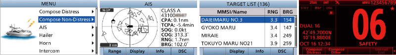 The integrated AIS receiver shows real-time AIS vessel traffic information on the display. The AIS combo screen enables you to monitor the AIS plotter during basic operation. You can directly call a selected AIS target from the AIS screen using an individual DSC call.