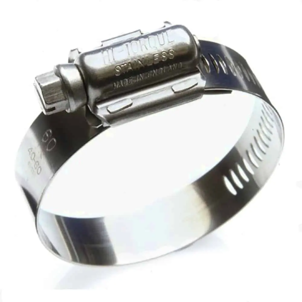 Hi-Torque hose clamps are specifically designed for use with wire reinforced hoses that require higher sealing pressures, and for when an extra margin of safety and reliability is required such as marine exhaust hoses. The Hi-Torque features a unique ‘straight line’ housing, which ensures that every thread of the screw is fully engaged with the band. Combined with the high tensile band and hardened rolled thread screw gives the Hi-Torque hose clips more than twice the strength of ordinary worm drive hose clips.