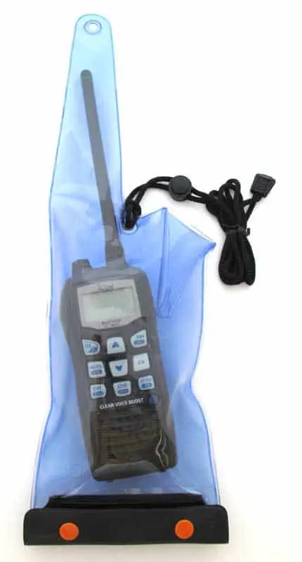 Reinforced waterproof VHF pouch for intensive or professional use. Triple zip seal and full width bottom quick closing clip for easy access. Features innovative finger insert for easily turning knobs or dials. Ideal for use in kayaks, sailing schools, canoeing and other activities where even waterproof VHF radios are at risk.