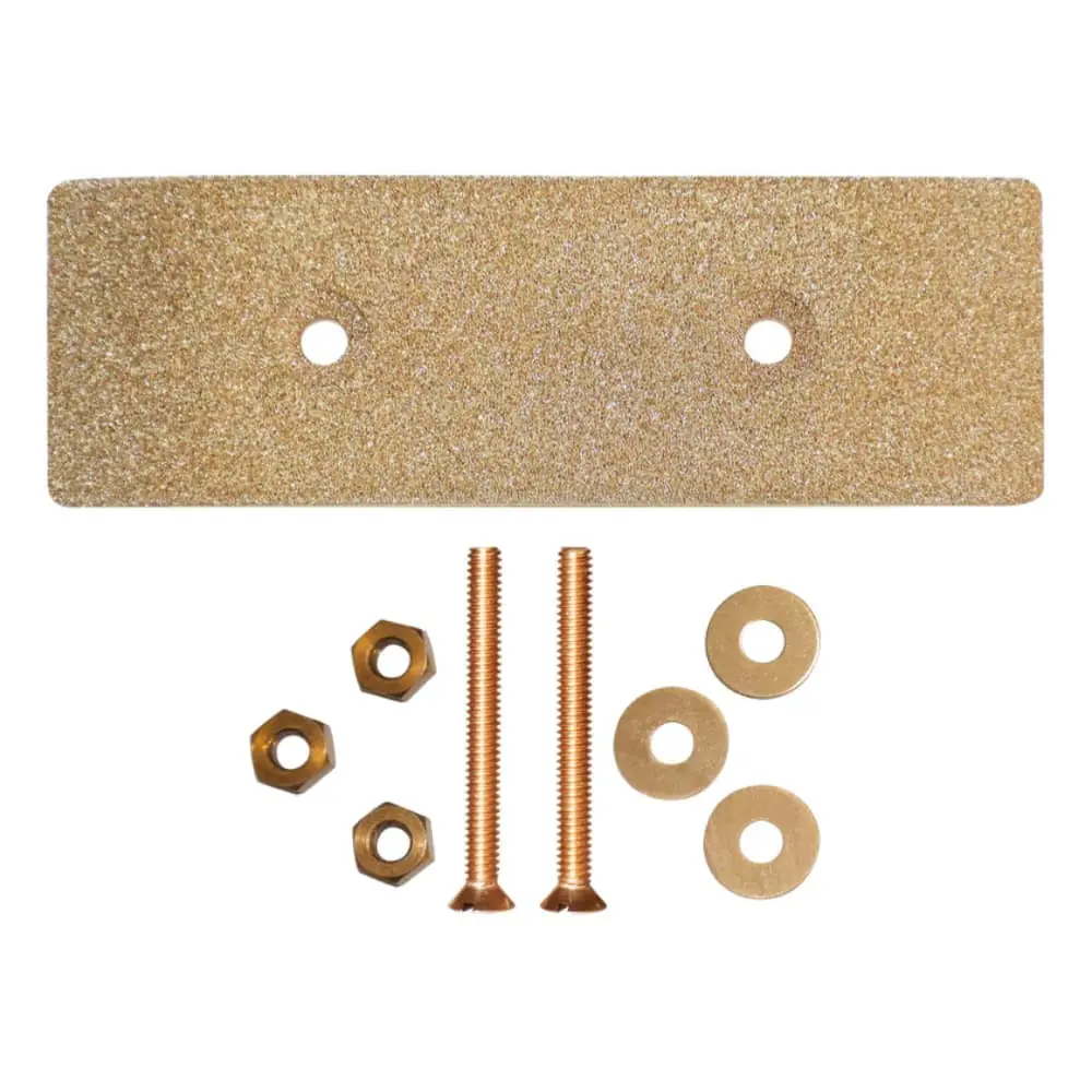 Placa de bronce porosa sinterizada. En comparación con el bronce sólido de las mismas dimensiones, la porosidad permite un aumento masivo de la superficie en contacto con el agua aumentando enormemente el tamaño equivalente. Ideal para conectar a tierra equipos de radio y electrónicos y reducir las interferencias de radiofrecuencia. Perfecto para equipos de radio Navtex, GPS, VHF y BLU, MF/HF.