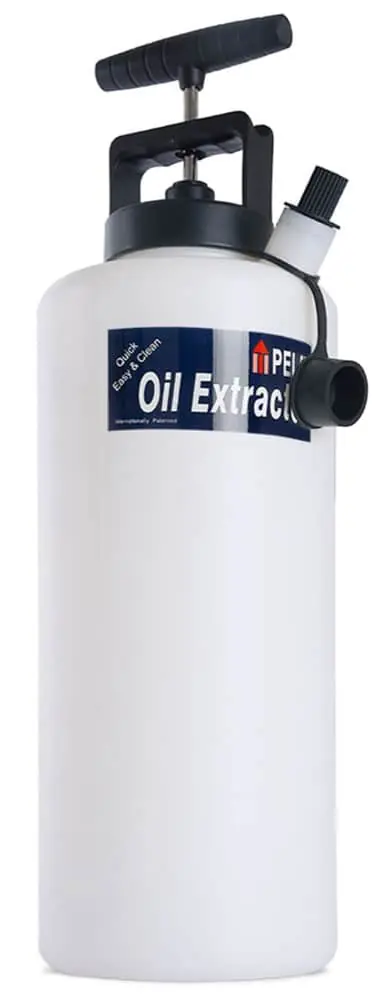 Pela oil extractors are equipped with a manually operated vacuum pump connected to a container. The oil extractor has a 5 mm diameter semi-flexible extractor tube connected to another transparent tube for inspection of the operation. The total length of over 2 meters allows the pump to be operated from an easily accessible location. Insert the puller tube into the oil dipstick opening and operate the pump 5 to 10 times and watch as the old oil is sucked out of the engine and into the container without mess or spillage. The container has an easy to use spout to empty the waste oil.