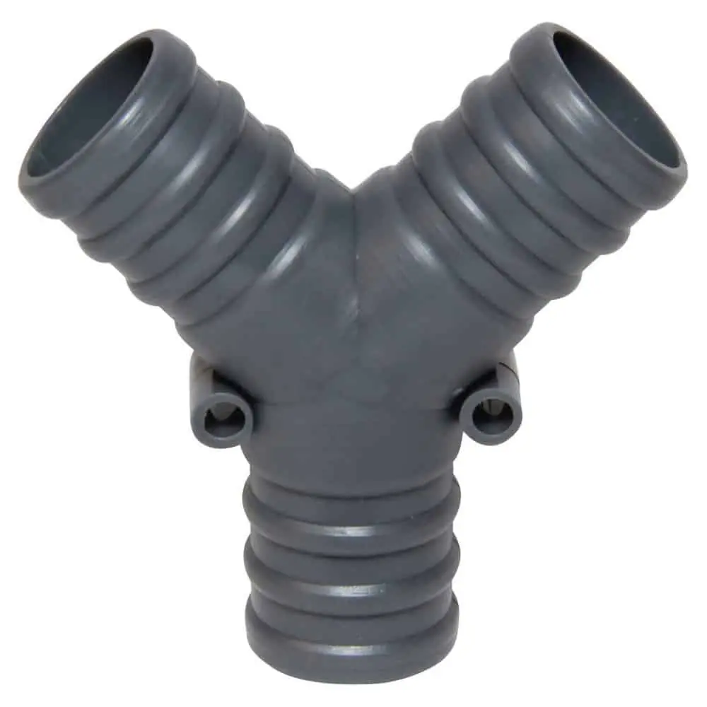 Polypropylene Y hose connector with mounting screw holes for securing to a bulkhead,  ideal for connecting multiple hoses.