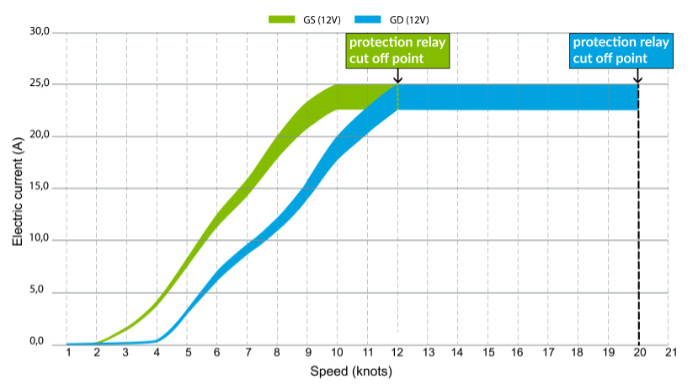 Day or night, sunny or cloudy, sailing upwind or downwind, the Wave 3 keeps generating electricity as long as the boat is moving through the water. At 6 knots boat speed, the Wave 3 generates 13 Amps at 12V DC, over 300 Ah per day.