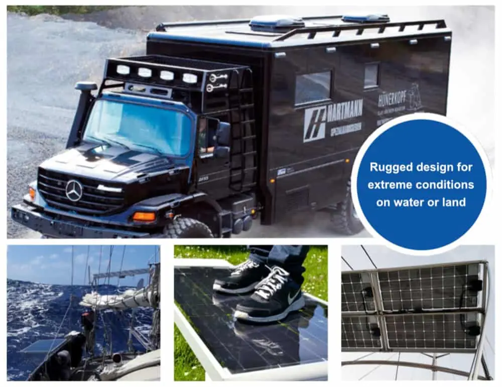 The Solara S-Series Vision solar panels have been designed from the beginning for extreme conditions both on water and on land, from intense tropical heat to extreme arctic cold and thanks to their rigid hollow aluminium frame, are ideal for marine use, where unsupported flexible and semi-flexible panels are not suitable, such as stern arches.