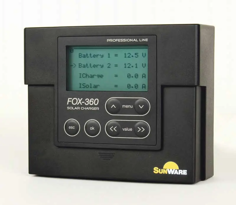 Sunware Fox 360 for 2 battery/battery bank systems. The regulator is set by default to 90% battery 1 /10% battery 2 but can easily be adjusted via the menu system.