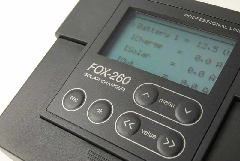 LCD Display - The backlit graphical LCD display has been designed for simple intuitive operation even without the manual and features large characters for viewing across the cabin and without reading glasses. After pressing a button, the backlight remains active 30 sec. Quick adjustment of all settings via the intuitive menu system and an in depth view of both solar power production and charging current. Sunware Fox 260 & 360 LCD Display