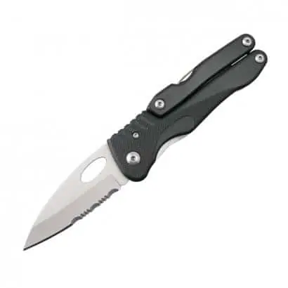 La SL Plier tiene una hoja de acero inoxidable muy afilada en forma de lanza puntiaguda en el elegante cuerpo de el estilo "táctico". Una multiherramienta versátil, resistente, con dos tipos de destornillador estrella y plano, alicates y corta alambres. Tiene pequeñas ranuras en el borde superior, donde apoyamos el pulgar, para un mejor sensación de agarre.