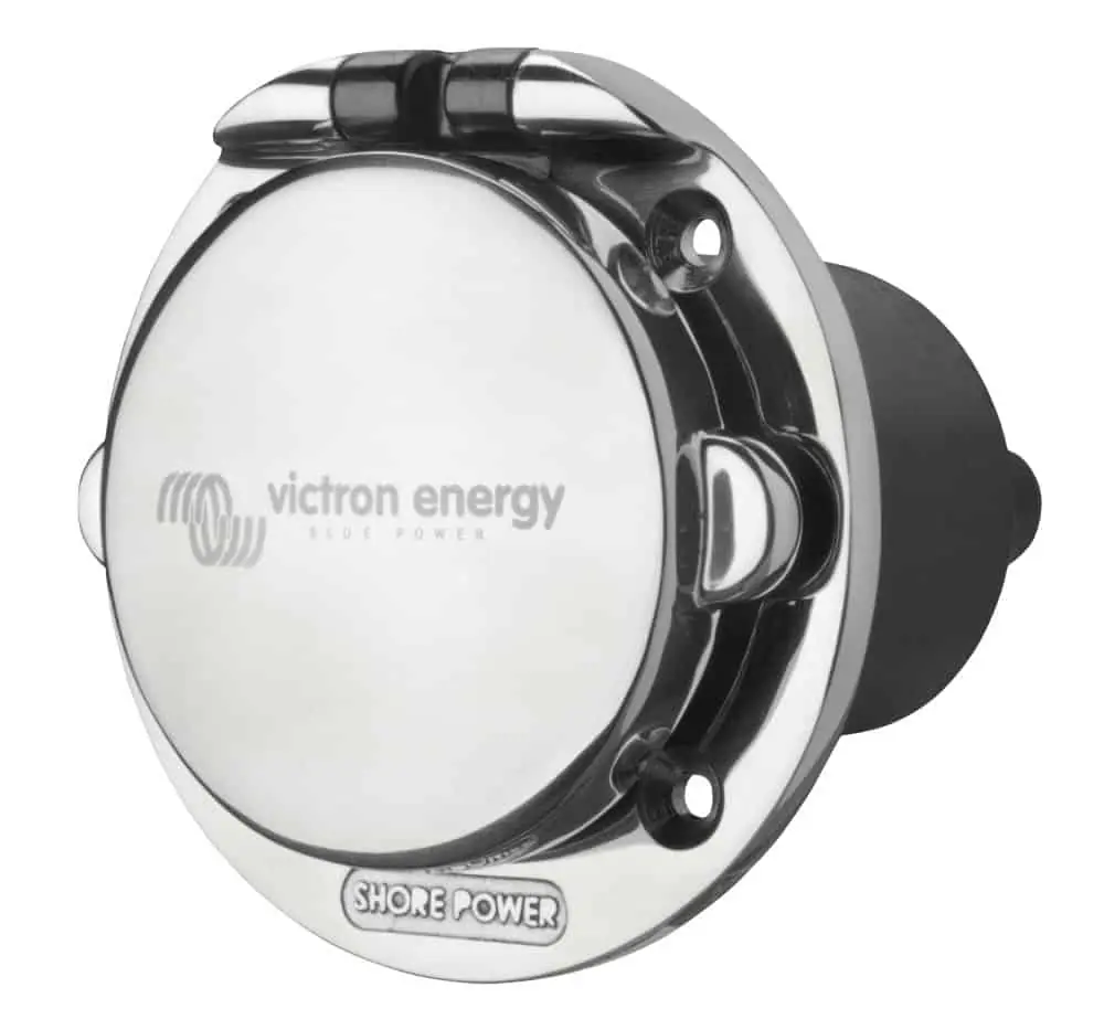 Enchufe toma de puerto en inox pulido 316 de fabricación robusta. Calificación de hasta 250V de corriente alterna y disponible en versiones 16A y 32A. Resistente al agua a IP 56. Compatible con los cables de alimentación de tierra, adaptadores y enchufes de Victron Energy. Versión de polímero composite también disponible.
