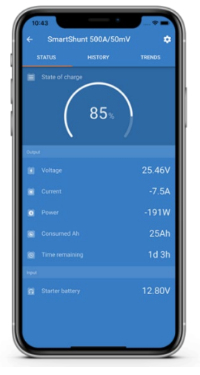 The SmartShunt combines a battery shunt with both Victron VE.Direct and bluetooth connectivity allowing either connection to a Victron GX device or to your phone or tablet. With the free VictronConnect app, your phone becomes your battery monitor allowing easy monitoring of battery parameters such as state of charge, time to go, historical information and much more. Built in alarms can be configured for early detection of problems. Thanks to the integrated bluetooth connectivity, the SmartShunt can also be used with other devices such as a Raspberry Pi and SignalK.