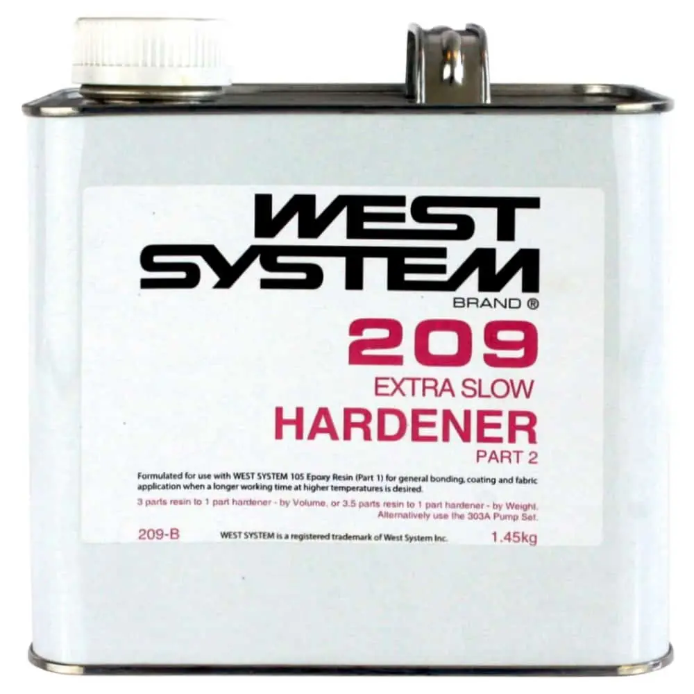 West System 209 Extra Slow Hardener has been formulated for both coating and bonding applications in very warm and humid conditions or when extra working time is required. Provides approximately twice the working time compared to 206 Slow Hardener. West System 105/209 forma a clear amber coloured solid and is therefore not intended for clear coating.