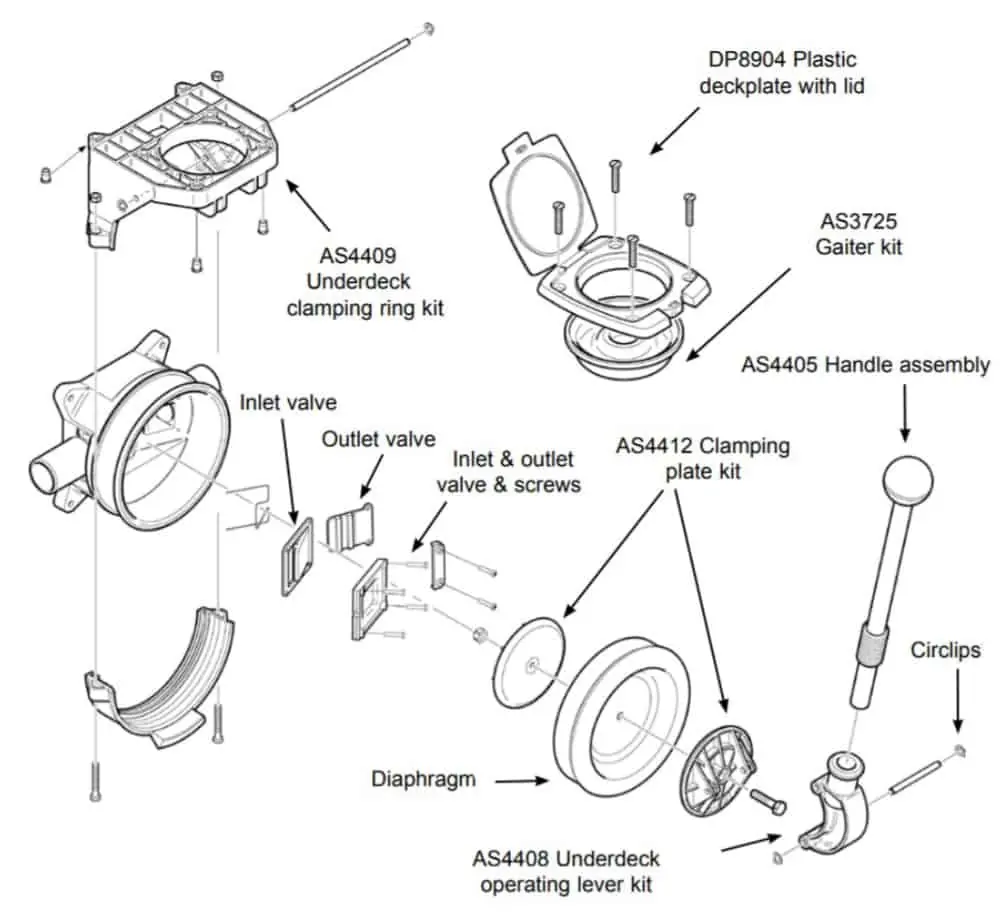 Complete set of serviceable parts for the Whale Gusher® Titan manual bilge pumps.