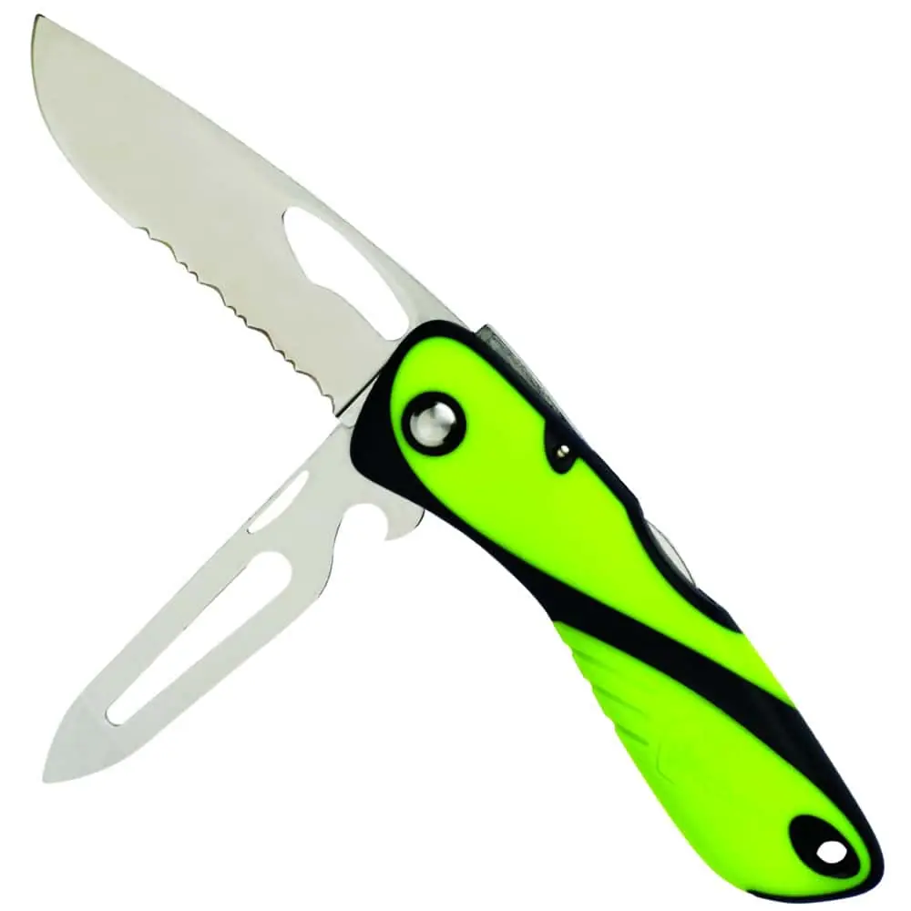 • Fluo - fluorescent yellow with partially serrated blade, shackle key/marlin spike and bottle opener.